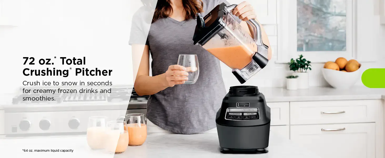 - POWERFUL CRUSHING: The 72-oz. Total Crushing Pitcher pulverizes ice to snow in seconds for creamy frozen drinks and smoothies with a powerful 2-plus horsepower motor. (64-oz. max liquid capacity).