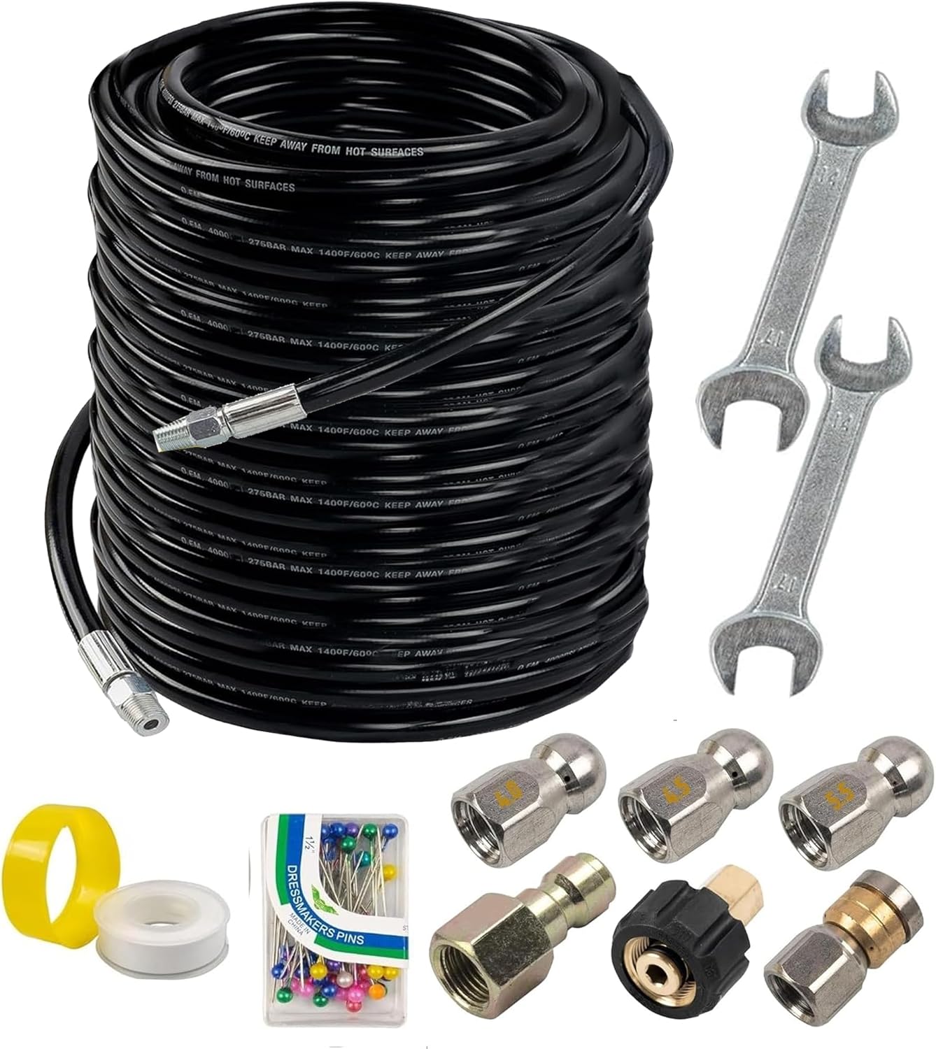 - Sewer Jetter Kit Package Incldue: 1 × 100ft sewer jet hose with 1/4" NPT male connector, 1 × Orifice 4.0 button nose sewer jet nozzle, 1 × Orifice 4.5 button nose sewer jet nozzle, 1 × Orifice 5.5 button nose sewer jet nozzle, 1 × M22 female thread to 1/4" female thread coupler, 1 x 1/4" quick connector, 1 x rotating nozzle, 1x waterproof tape, 1 box x pearl corsage pin, 2 x spanners.