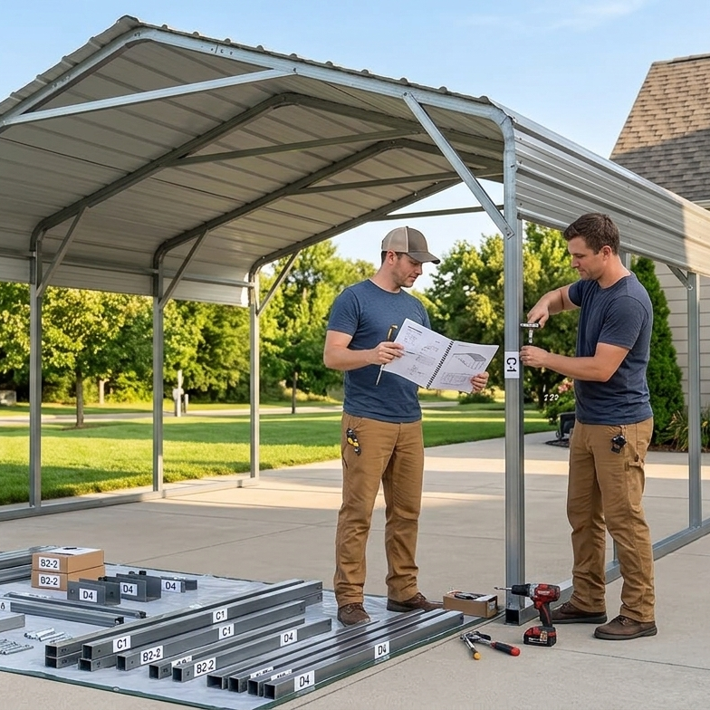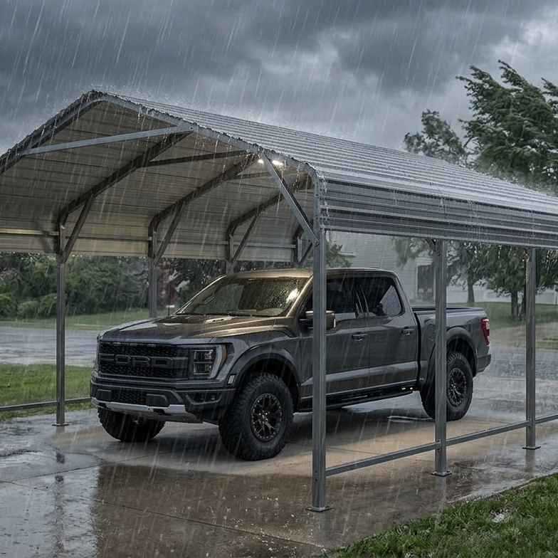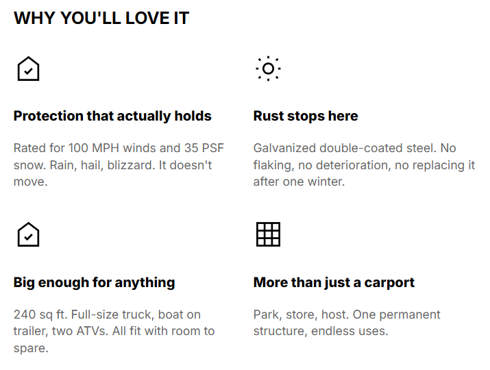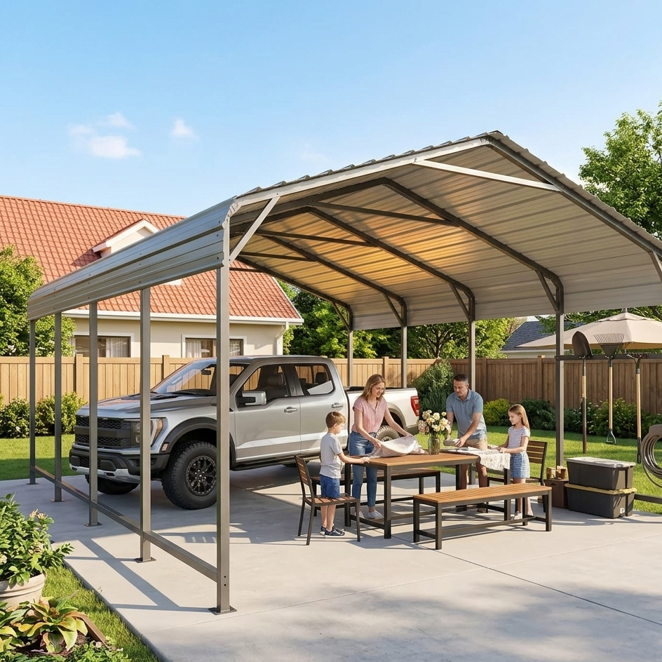 240 square feet of covered space with a galvanized steel roof rated for 100 MPH winds and 35 PSF snow loads. Anti-rust frame, waterproof sealed panels, reinforced base anchors. Coded and numbered parts so assembly is straightforward. Protects your car, your boat, your truck or becomes an outdoor workspace, a party shelter, a storage structure.