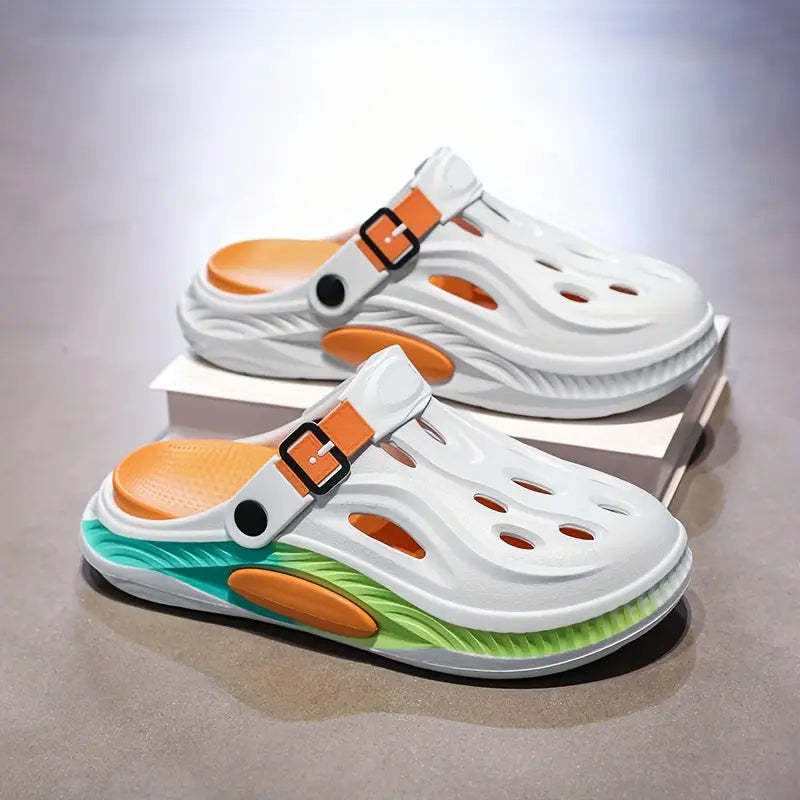Package Includes: 1× Men’s Color Blocking Thick Sole Breathable Clogs