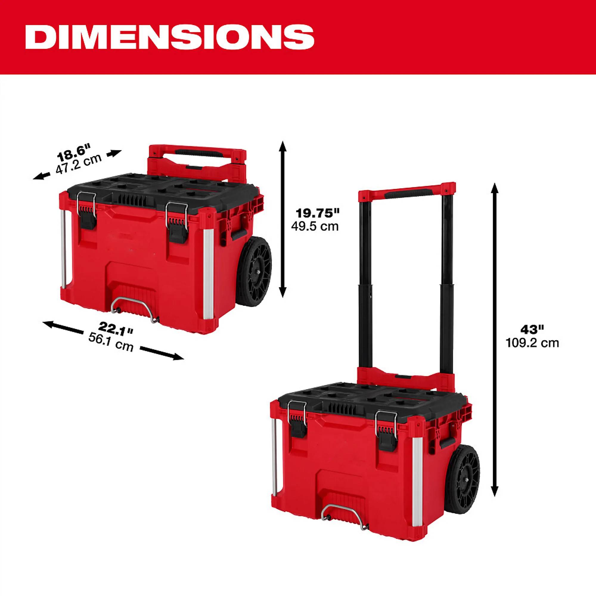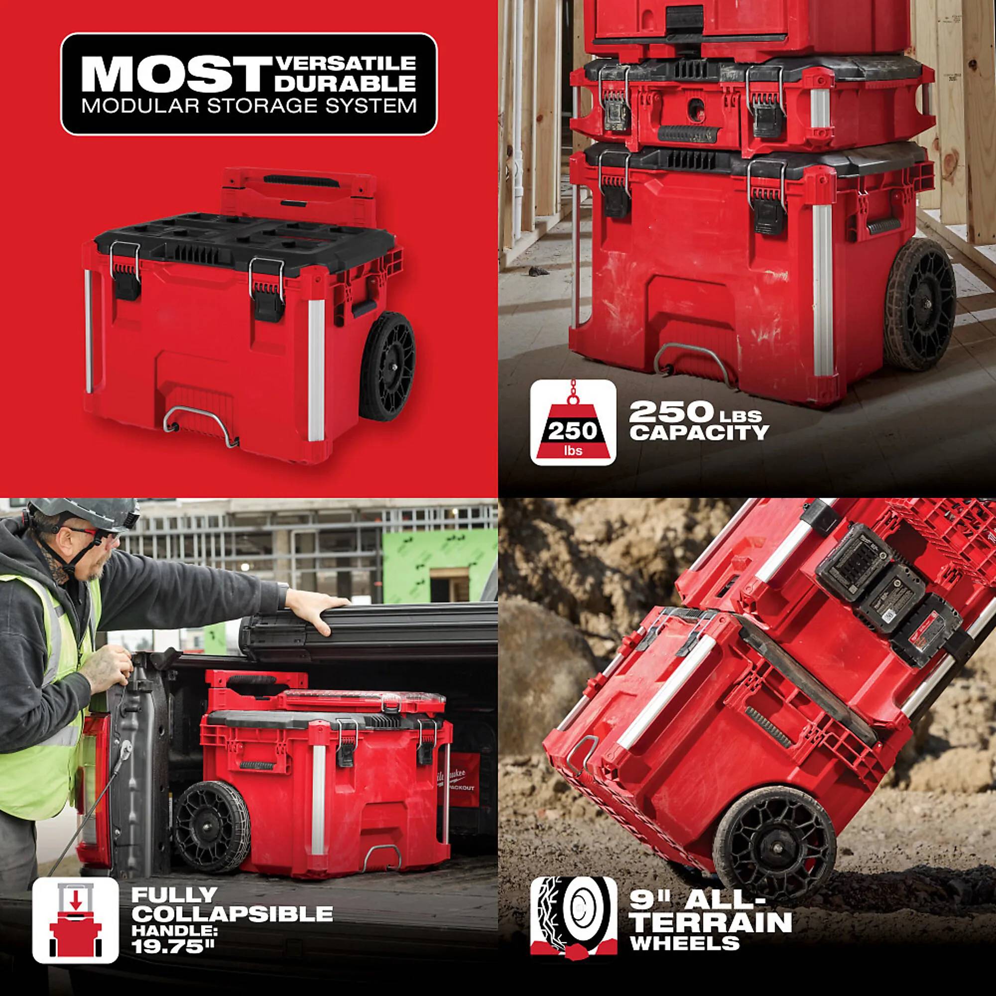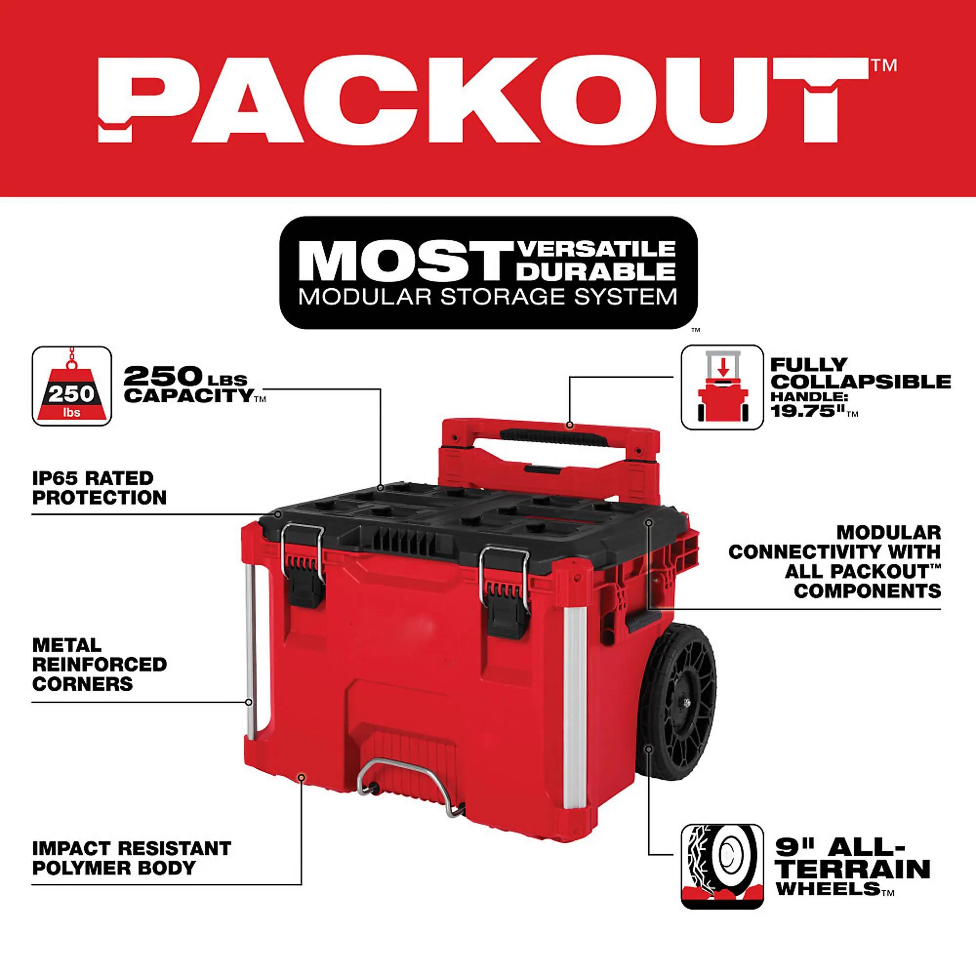 Packout, 22", Rolling Tool Box, Compatible With Packout Modular Storage Products, Industrial Grade Extension Handle, 9 All Terrain Wheels, IP65 Rated Weather Seal, Metal Reinforced Corners & Locking Point, Mounting Location For The 1 Key Tick, Heavy Duty Latches. Packout, Heavy Duty Latches. Does not included interior tool tray.
