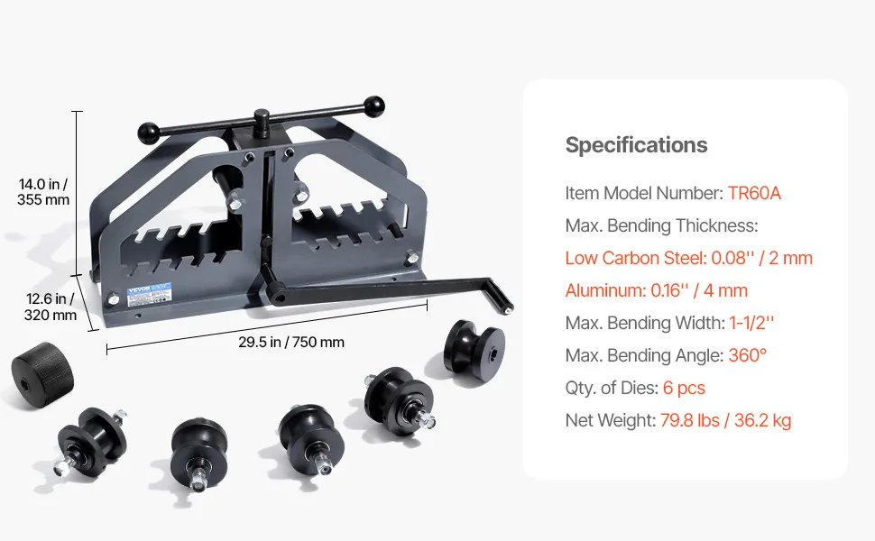 The tube roller bender combines exceptional bending capability with durable construction, making it an essential tool for metalworking projects. It can bend pipes up to 1-1/2" wide with a maximum bending angle of 360°, and comes with 6 premium dies, ensuring high bending efficiency and quality.